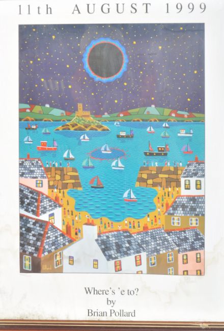 Brian Pollard (b. 1954) - A late 20th Century 1999 signed limited edition print entitled 'Where's 'e to?'. The print was to commemorate the 1999 eclipse. Signed in pencil to the lower right and numbered 956/1000. Together with prints from the Barbican Gallery by Pollard. All framed and glazed. The 1999 signed print with water damage to the lower section. Each measures approx; 61cm x 49cm.
