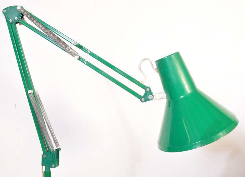 HCF - A retro vintage 20th Century Danish anglepoise floor standing lamp light finished in green having an aluminium pendant shade with cooling holes to the back. Raised and detecting from a single stem stand upon a weighted circular base. Makers marks present to the arm. Sold as untested, good example. Measures approx; 153cm tall.