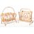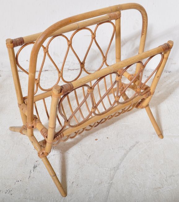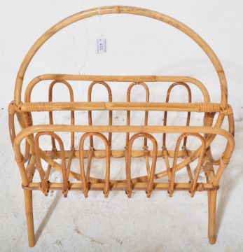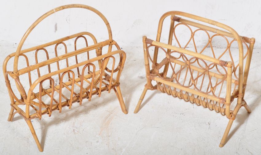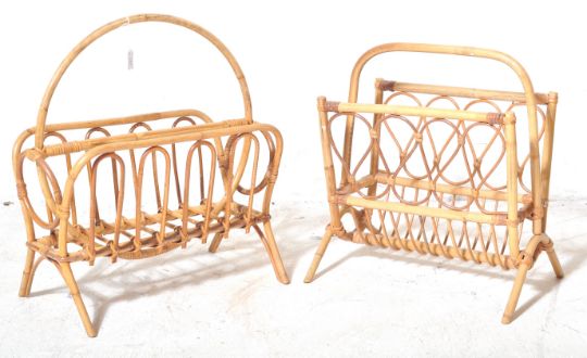 Two retro vintage mid 20th Century circa 1970s bamboo magazine rack in the style of Franco Albini. Each magazine rack having a carrying handle to the top over hooped sides raised on splayed supports. Largest measures approx; 46cm x 51cm x 29cm.