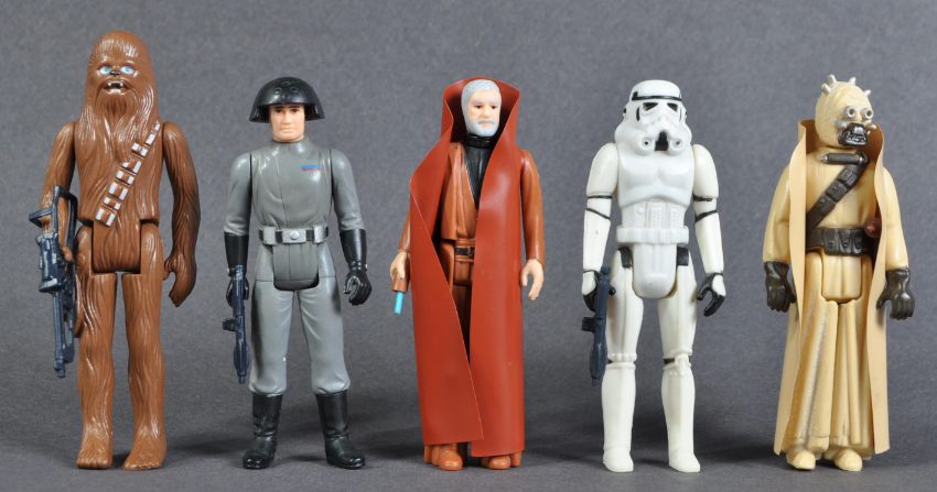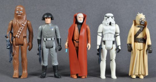 Star Wars - First 12 - a collection of x5 of the ' First 12 ' original vintage Kenner / Palitoy made action figures released. Comprising; Ben (Obi-Wan) Kenobi (GMFGI 1977 Hong Kong COO - Lightsaber lacking tip), Chewbacca (GMFGI 1977 no COO), Stormtrooper (GMFGI 1977 China COO), Sand People (GMFGI 1977 Hong Kong COO) and Death Squad Commander (GMFGI 1977 Hong Kong COO). All 100% complete with original weapons / accessories. Various conditions, but all generally EX to NM.