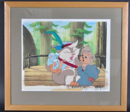 Star Wars: Ewoks (Animated Series) - an original production used large format animation artwork cel. The multi-layer cel featuring several Ewoks. Mounted on a reproduction background of Endor forest. Professionally framed and glazed. Total size; 42cm x 47cm.