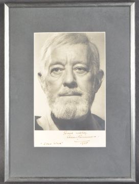 Star Wars - Sir Alec Guinness (1914-2000 Obi-Wan Kenobi) - scarce autographed 5x8" black and white photograph of Guinness in the movie. Signed in black ink, to the margin, undedicated, with Guinness adding ' Star Wars '. Dated 1978. Signed photographs of Guinness in the iconic role are very scarce, and ones with the addition of the film title and date shortly after production are considered holy grails for many collectors. Conservation framed to a total size of 31cm x 23cmProvenance; originally donated by Guinness to a school charity fundraiser auction in the 1970s. Purchased thereafter by our vendor.