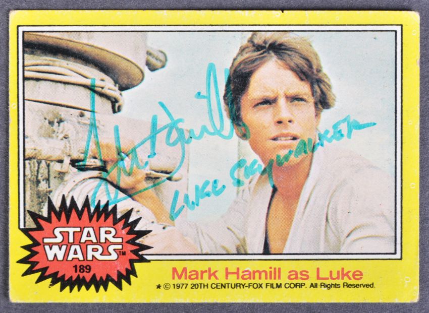 Star Wars - Mark Hamill (Luke Skywalker) - scarce autographed vintage 1977 Topps trading card. Signed in green ink, with full character name added. Undedicated. Certificate of authenticity from Autografica (Garry King - RACC, AFTAL & UACC).