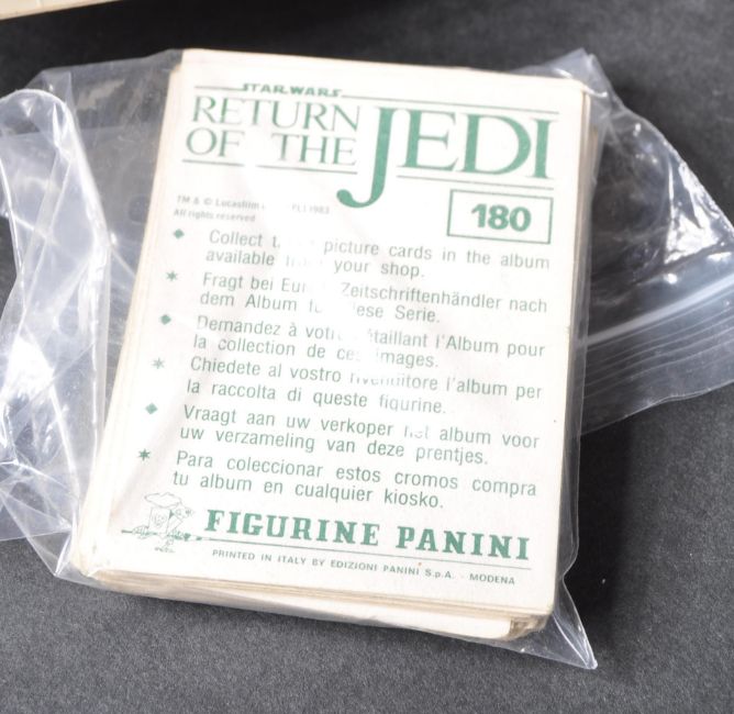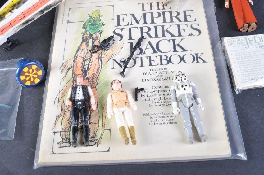 Star Wars - a collection of assorted original vintage Kenner / Palitoy made Star Wars action figures, playsets and other vintage items. To include; an AT-AT playset (lacking chin guns, battery cover and bulb cover), Snowspeeder, Speeder Bike, X Wing Fighter (all incomplete to various degrees), x4 vintage action figures - Han Solo, Obi-Wan, Princess Leia and AT-ST Driver, Return Of The Jedi Panini cards (x2 incomplete sets), some loose accessories, and an original vintage The Empire Strikes Back Notebook script book.