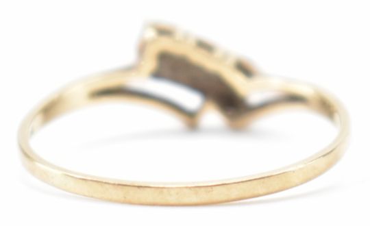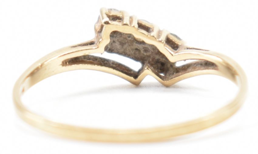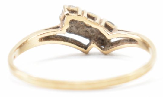 A hallmarked 9ct gold and white stone wish bone ring set with three round cut white stones. Hallmarked London 1988. Weight 1.2g. Size Q.5.