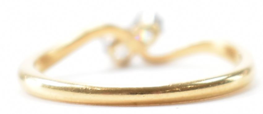 An 18ct gold and platinum and diamond crossover ring. The ring being set with two round cut diamonds, band being marked 18ct. Weight 3.2g. Size S. Diamonds measure 3.5mm diameter.
