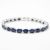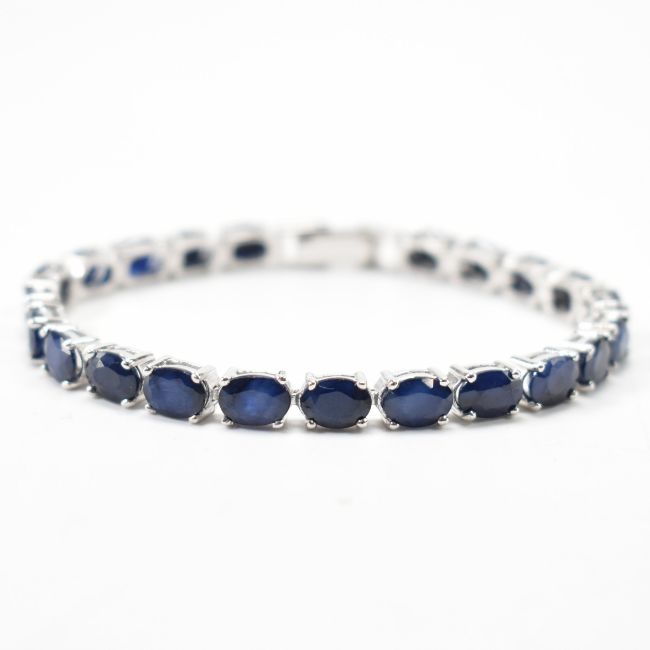 A silver and blue stone line bracelet. The bracelet being set with oval cut blue stones with a catch clasp. marked 925. Measures 7 inches. Weight 15.1g.