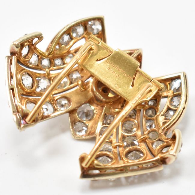 A French Chaumet Paris diamond brooch clip . The brooch clip set with old cut diamonds having a twin pin verso. Signed Chaumet Paris having French eagle assay mark. Principal centre diamond visible 5.5mm x 5.6mm x 4.6mm.  Estimated total diamond weight 9ct. Weight 19.02g.  Measures 4.2mm.