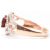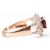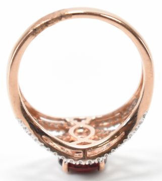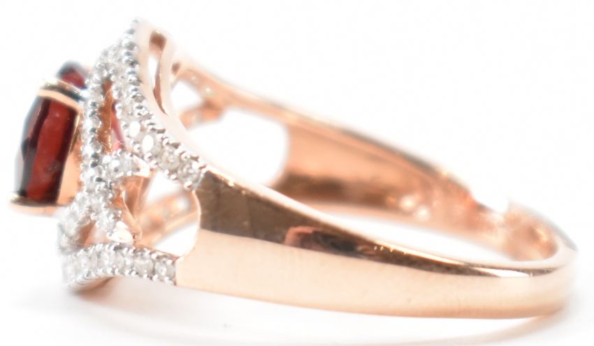 A gold garnet and diamond dress ring. The ring being set with a round cut garnet to the head with pierced shoulders set with diamond accent stones. Marked 14k to shank. Weight 3.4g. Size N.5.