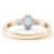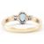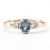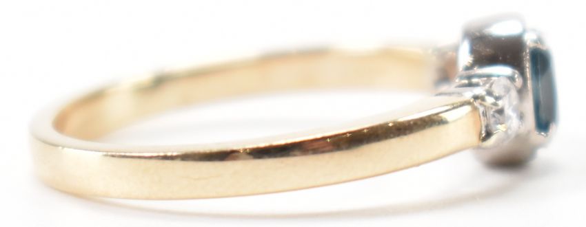 A hallmarked 9ct gold, diamond & blue three stone ring. The ring having a central oval cut prong bezel set blue stone flanked by two round brilliant cut basked set diamonds on a plain squared shank. Hallmarked for Birmingham. Total weight approx 2.6g. Size M.5.