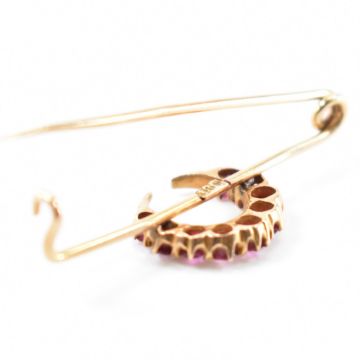 A 19th Century Victorian 18ct gold & ruby crescent brooch. The brooch of safety pin form set with nine graduating round cut rubies. Marked 18ct to verso. Measures 3.9cm wide. Weight 2.1g.