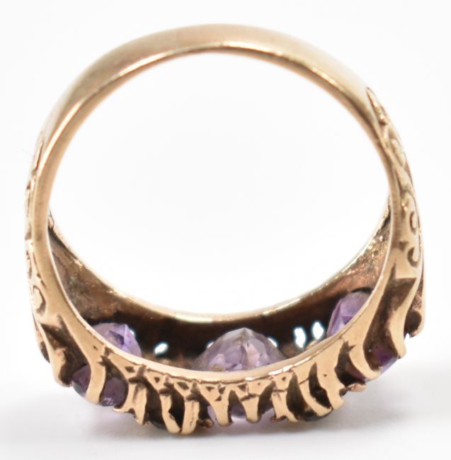 A hallmarked 9ct gold purple and white stone ring. The ring being set with three oval cut purple stones with white accent stones. Hallmarks present but rubbed. Weight 5.1g. Size P. Central stone measures 8.5 x 6 x 4.4mm.