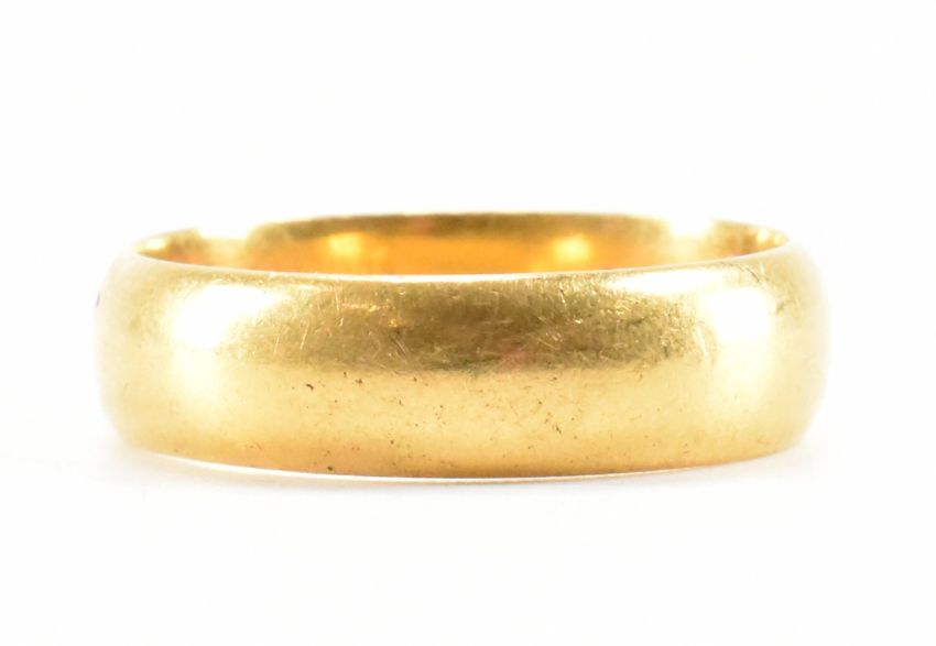 A hallmarked 22ct gold wedding band ring. The ring being of D shape. Hallmarked London 1970. Weight 6.2g. Size P.