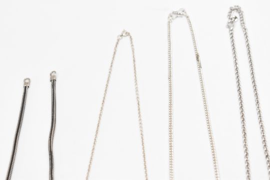A group of silver and stone set necklaces. The lot to include a faux opal festoon necklace, a brown and yellow stone collar necklace and a turquoise set necklace (missing clasp). All marked 925. Longest measures 14 - 19 inches. Total weight 102.4g.