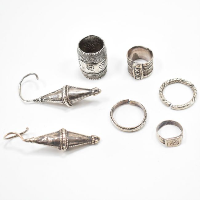 A collection of Middle Eastern Omani silver tribal jewellery. The lot to include a pair of bicone drop earrings, silver hoops and three silver rings all with moulded and hammered detailing. Earrings measure 7cm, rings sizes O - R. Total weight 54.1g. All unmarked, tests indicate silver.