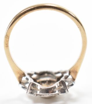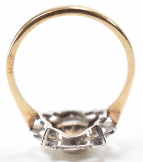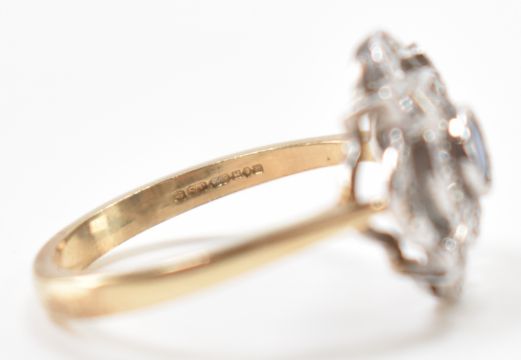 A hallmarked 9ct gold diamond & blue stone ring. The ring having a central  bezel set round cut blue stone surrounded by surface set diamonds to the art deco style head on pinched shoulders. Hallmarked for Birmingham. Central stone measures approx 3.5 x 3.5 x 2.1mm. Diamonds measure approx 1.5 x 1.5mm. Total weight approx 3.1g. Size P.