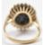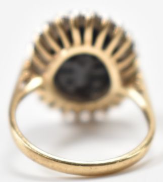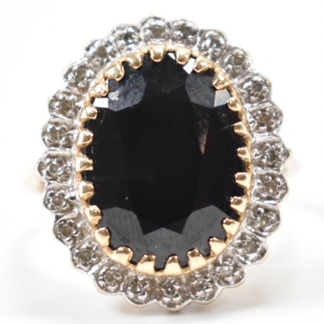 A hallmarked 9ct gold sapphire and diamond ring. The ring being set with an oval cut sapphire with a halo of diamonds. Import marked Sheffield. Weight 4.8g. Size O.5. Sapphire measures 14.7 x 11 x 5.7mm.