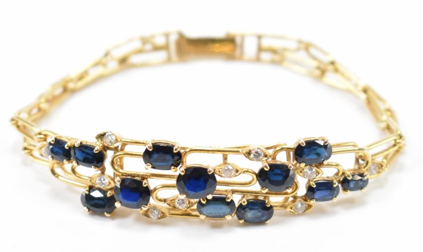 A vintage gold sapphire and diamond bracelet. The bracelet twelve oval cut sapphires with ten round brilliant cut diamonds in an open worked mount on a bar link chain bracelet. Marked 585 to the clasp. Measures 6.5 inches. Weight 14.4g. Largest sapphire measures 6.4 x 5.5 x 3mm.