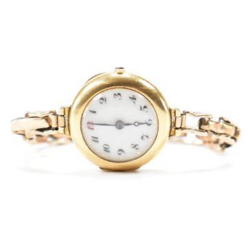 An early 20th Century 18ct gold cased wrist watch. The watch having a round white enamelled face with Arabic numerals to the chapter ring on an expandable gold plated strap. Interior case hallmarked London 1919. AF, crown not present, not in working order, back hinge in need of replacing.