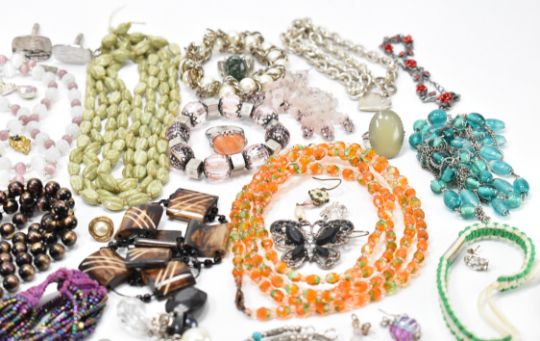 An assortment of costume jewellery. The lot to include; chains, necklaces, beads, white metal, stone, glass, abalone, shell, earrings, rings, yellow metal, charms, hair pin, wood, simulated pearls, bracelets, mother of pearl, cufflinks, bangles, pendants, enamel, charm bracelets & yellow metal.