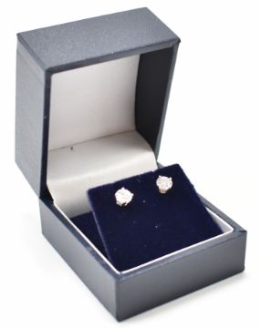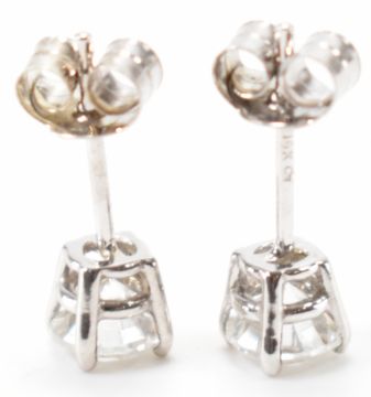 A pair of white gold and diamond stud earrings. The earrings being set with round brilliant cut diamonds, set within a prong set stud mount. Posts marked 14k. Diamonds measure 4.9mm diameter, diamonds enhanced. Weight 0.9g.