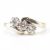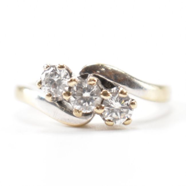 A hallmarked 18ct white gold and diamond three stone crossover ring. The ring being set with three round brilliant cut diamonds. Hallmarked London. Weight 4.2g. Size I. Estimated 0.54ct in total.