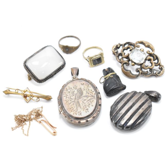 A collection of 19th Century Victorian jewellery. The lot to include a yellow metal hair panel ring, a white agate brooch with a silver mount, a yellow metal bar brooch, a gold plated brooch set with a faceted blue stone, a cat pendant, a gold tie pin safety chain and two Victorian silver lockets. Blue stone brooch measures 4.7cm wide.