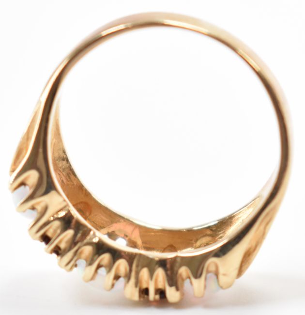 A hallmarked 9ct gold & opal ring. The ring having three claw set synthetic opal cabochons separated by two rows of red stones, on reeded shoulders with a tapered shank. Hallmarked for Birmingham. Central opal measures approx 8 x 6 x 2.3mm. Red stones measure approx 2 x 2 x 1.2mm. Total weight approx 5.1g. Size Q.5.