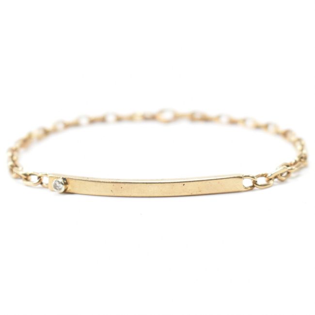 A vintage gold and diamond identity bracelet. The bracelet having a rectangular bar to the centre, bezel set with a round cut diamond on an oval link chain with a spring ring clasp. Marked 9ct to the spring ring. Weight 7.4g. Measures 7 inches.