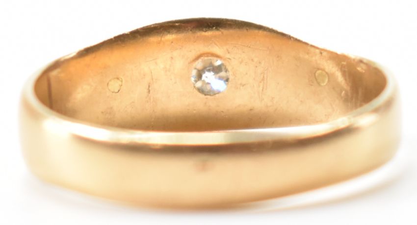 A vintage gold and diamond ring. The ring having a plain band with a round old cut diamond. Diamond measures 3.5 x 2.6mm. Unmarked tests indicate 18ct gold. Weight 4.4g. Size W.