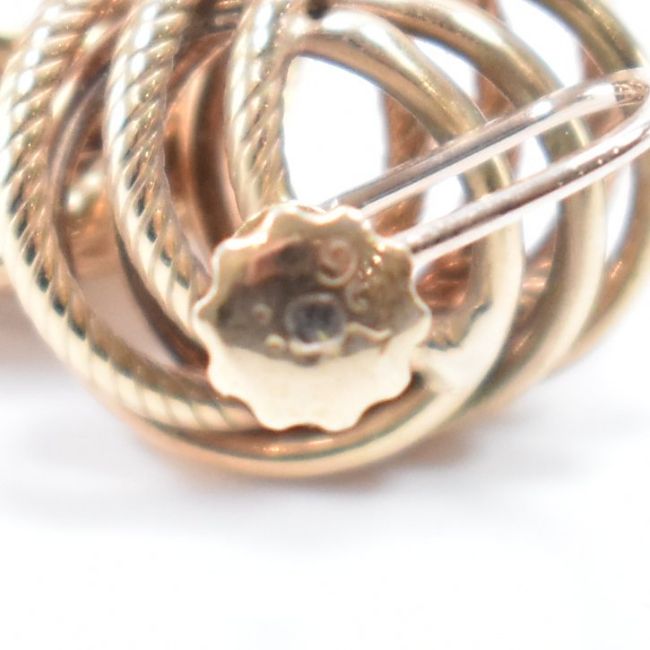 A pair of vintage gold knot earrings together with a Victorian gold plated mourning brooch. The earrings having round entwined knot heads with screw backs to the verso (marked 9ct to the screw backs). The brooch having a central glazed panel with a border of coral cabochons. Earrings weight 4.1g. Heads measure 1.7cm wide. Brooch measures 2.3cm wide.
