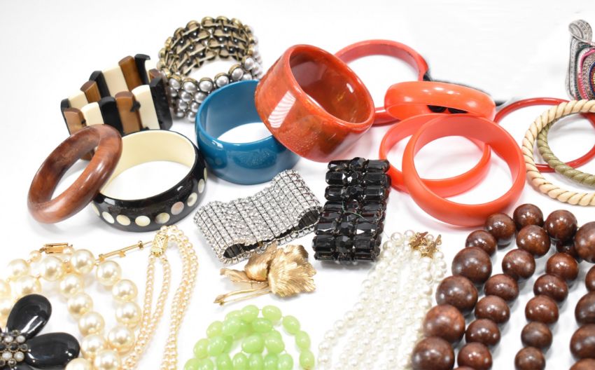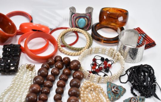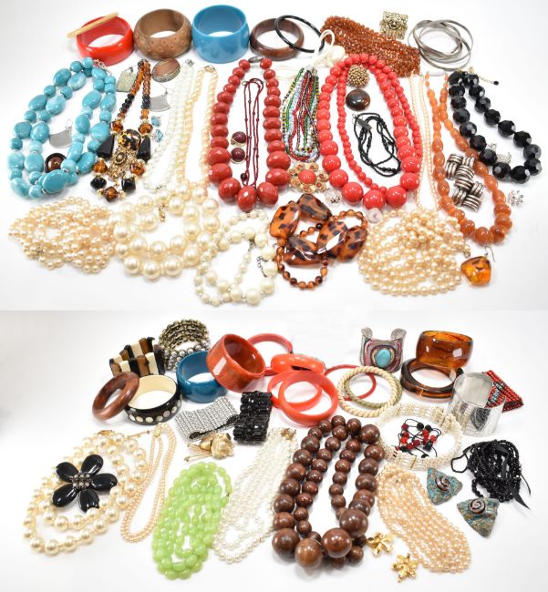 A large collection of vintage costume jewellery to include several bead necklaces, bangles, a Victorian reproduction brooch and pendant, a carnelian cabochon set pot lid, modernist style earrings, gold plated orchid brooches, vintage stone set brooches, wooden beads, a tribal bead bracelet and more.