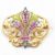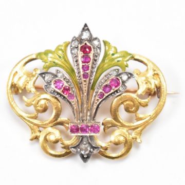 A French Art Nouveau ruby and diamond enamel brooch pin. The brooch having a fleur d lis, set with mixed cut rubies and rose cut diamonds having enamel foliate decoration. Unmarked tests indicate gold and silver. Weight 10.29g. Measures 3.5cm.