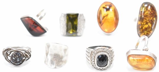 A group of ten silver and white metal rings. The rings to include six amber set rings (three marked 925, three unmarked but test as silver), a faceted black stone dress ring (marked 925), a hammered modernist ring (marked 925), a white metal and green tone ring and white metal wire work ring. Sizes range from N - R.5. Total weight approx 103g.