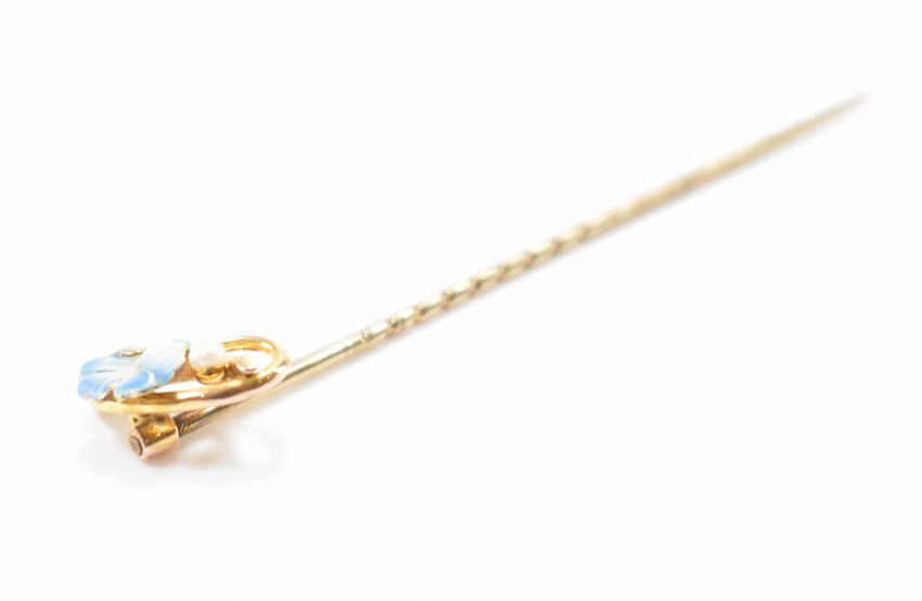 An early 20th Century Art Nouveau 9ct gold stick pin having an enamelled floral finial set with a seed pearl. Unmarked tests indicate 9ct gold. Measures 6cm. Weight 1.4g.