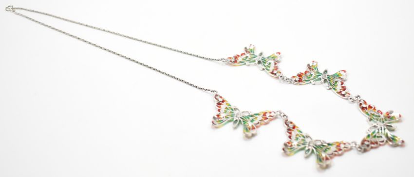 A silver and plique a jour enamelled butterfly collar necklace. Each butterfly having enamelled panels and set with marcasite's. Marked 925 to each butterfly and to the clasp. Measures approx 25 inches. Weight 24.0g.