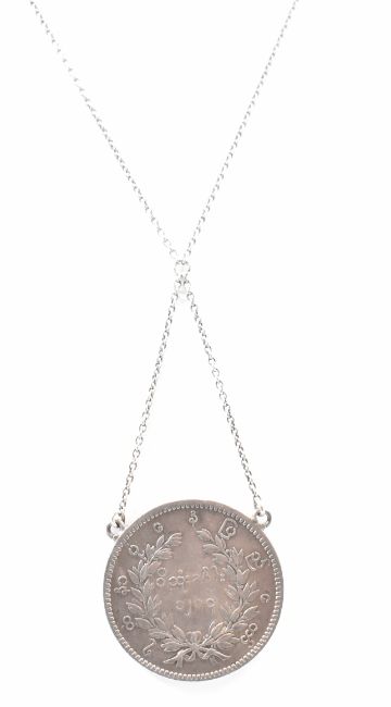 An enamelled Burma peacock rupee coin pendant necklace. The enamelled peacock coin suspended from a fine link silver chain with a spring ring clasp. Chain measures approx 16 inches. Weight 12.5g. Coin measures 3.1cm diameter.