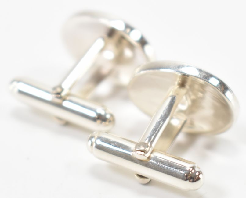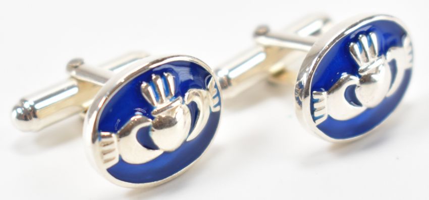A pair of silver and enamel Claddagh design cufflinks. The cufflink having an oval head with blue enamelling and swivel backs. Marked 925. Heads measure 1.8cm wide. Weight 9.1g.