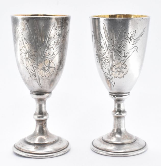 A pair of early 20th Century Russian silver vodka drinking cups / drinks measures. The cups in the form of miniature goblets with engraved floral decoration to the bowls and raised on knopped circular pedestal bases. Silver marks present and stamped 830. Measures approx; 7.5cm tall. Weighs approx 63.5g.
