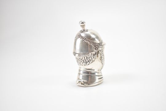 A silver plated vesta case in the form of an Edwardian policeman wearing a helmet. The vesta having a hinged compartment to the base. Measures 6.5cm tall.