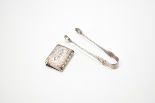 A pair of 19th Century antique silver hallmarked sugar tongs together with a Victorian silver plated vesta. The tongs having moulded rococo detailing with shell tongs (hallmarked Sheffield 1892), the vesta with date lozenge to the underside (AF). Tongs measure 11cm, vesta measures 4.5cm wide. Weight of tongs 25.2g.