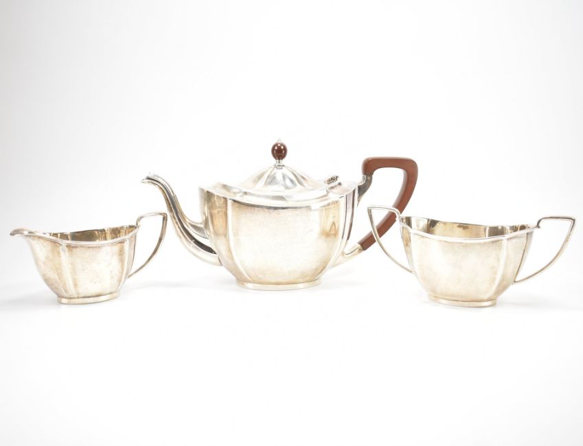 A 19th Century hallmarked silver three piece tea set. The service having serpentine form & reeded rims to the bowl & jug all raised on plinth bases. The teapot having simulated wood handle & finial, inscribed to the front as a gift at the 'Ladies Festival, as a token of their affection & esteem'. Hallmarked for Birmingham 1935, makers marks for Barker Brothers Silver Ltd. Teapot measures approx 16 x 28 x 12cm. Weighs approx 1012g.