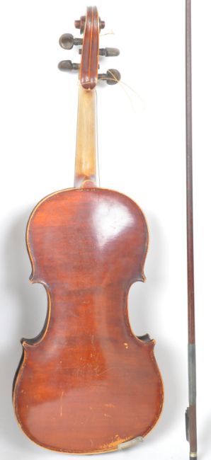 An early 20th century violin musical instrument having painted purfling edges with coloured chord strips. Held within an hard case with accompanying bow.