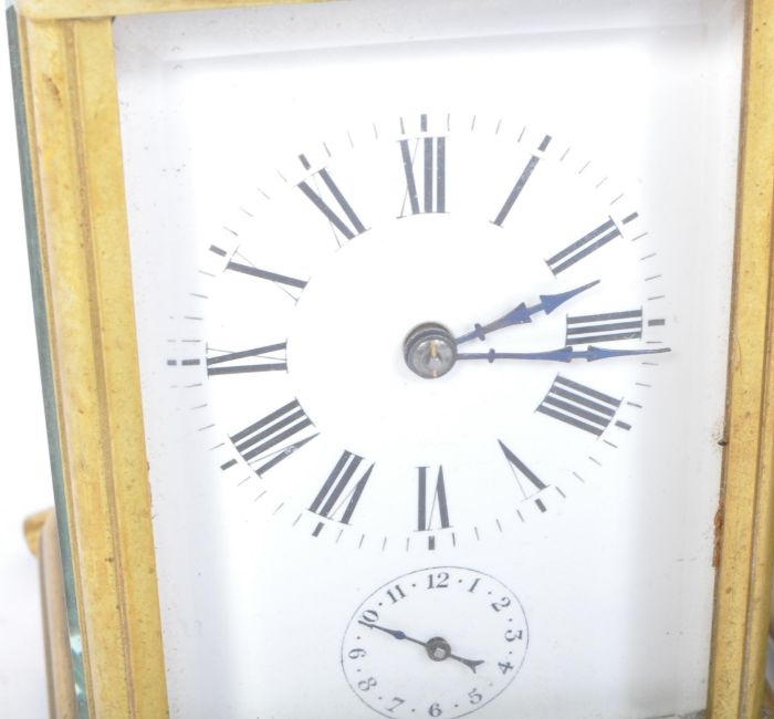 A vintage 20th century brass French Aiguilles repeating cased carriage clock with enamel clock face with Roman numerals to the chapter ring, marked to the back with key. Together with quartz Robt. Blandford carriage clock having shaped carrying handle to the top over a temple with columns shaped case raised on round feet. The clock having white enamel clock face with Roman numeral to the chapter ring.