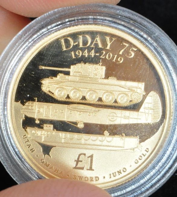 A 2019 Guernsey D-Day 75th Anniversary £1 22ct Gold Proof Coin. Featuring image of a tank, Bomber plane and landing craft on the reverse along with the names of the beaches the allied forces landed on. Accompanied by leaflet, box and sleeve. Total weight 7.98g. Diameter 22.05mm.