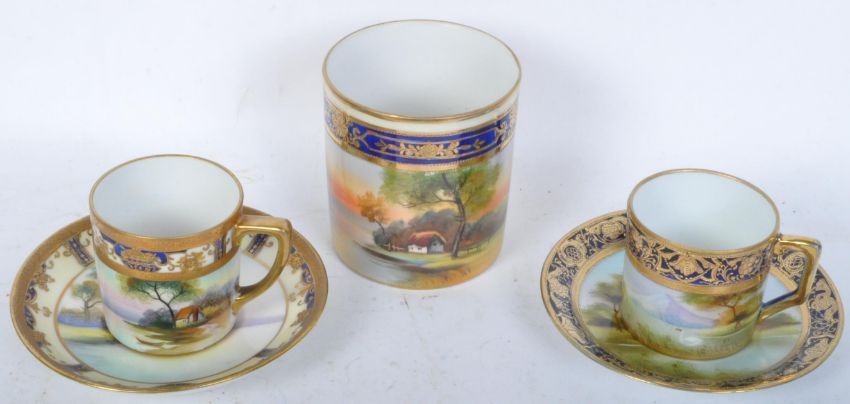 An assortment of early 20th century hand painted Noritake porcelain coffee cups & saucers with pot. The lot to include a cup & saucer with hand painted trees & lakeside decorations. A cup, saucer & pot with cottage, trees & lake side decorations. All marked to base. The lot appears in overall good conditions with minor wear commensurate with age.