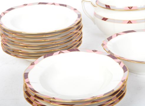 A large vintage 20th century Japanese Noritake bone china tea and dinner service. Comprising of teacups, coffee cups, saucers, side plates, plates, serving plates, tureens and more. Each piece having a white ground with geometric pink and gilt borders.
