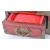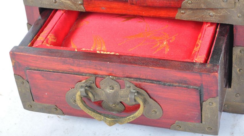 An early 20th century Chinese red lacquer jewellery box having engraved brass mounts alongside carved soapstone panels to the doors. The chest having twin doors opening to reveal a bank of three drawers. Measures 22cm tall.