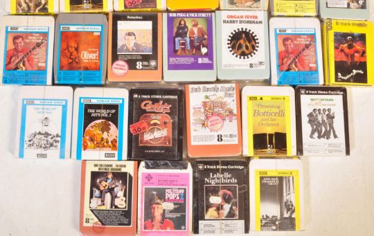 A large collection of vintage 20th century 8 Tracks to include Sounds Exciting, The World of Oliver, Presenting: Botticelli & his Orchestra, The World of Hits vol. 4, Bob Rowe's Music Box, Robertino, Tom Jones, Donna Summer, Adrian Baker, Gilbert O'Sullivan.