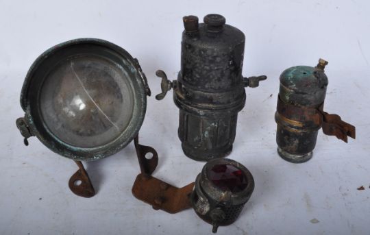 A collection of early 20th century Powell & Hanmer No. 145 Bike motorcycle lamps and parts. Measures 20cm length.